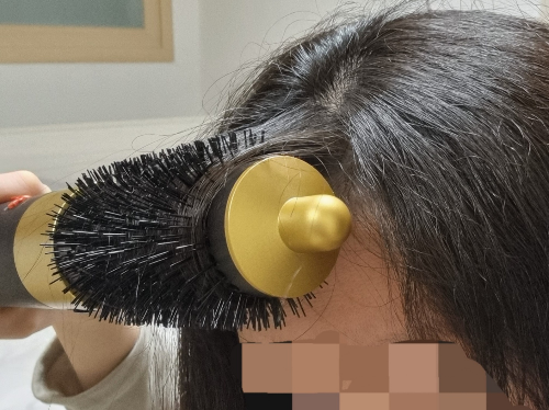 다음은 옆머리를 스타일링해보겠습니다. 배럴 사용 설정과 똑같이 바람세기, 온도를 설정하고 라운드 볼륨 브러쉬로 엎 머리를 만 상태에서 전원을 켜주면 됩니다. 머리 윗부분 볼륨이 살아난 게 보이시나요?